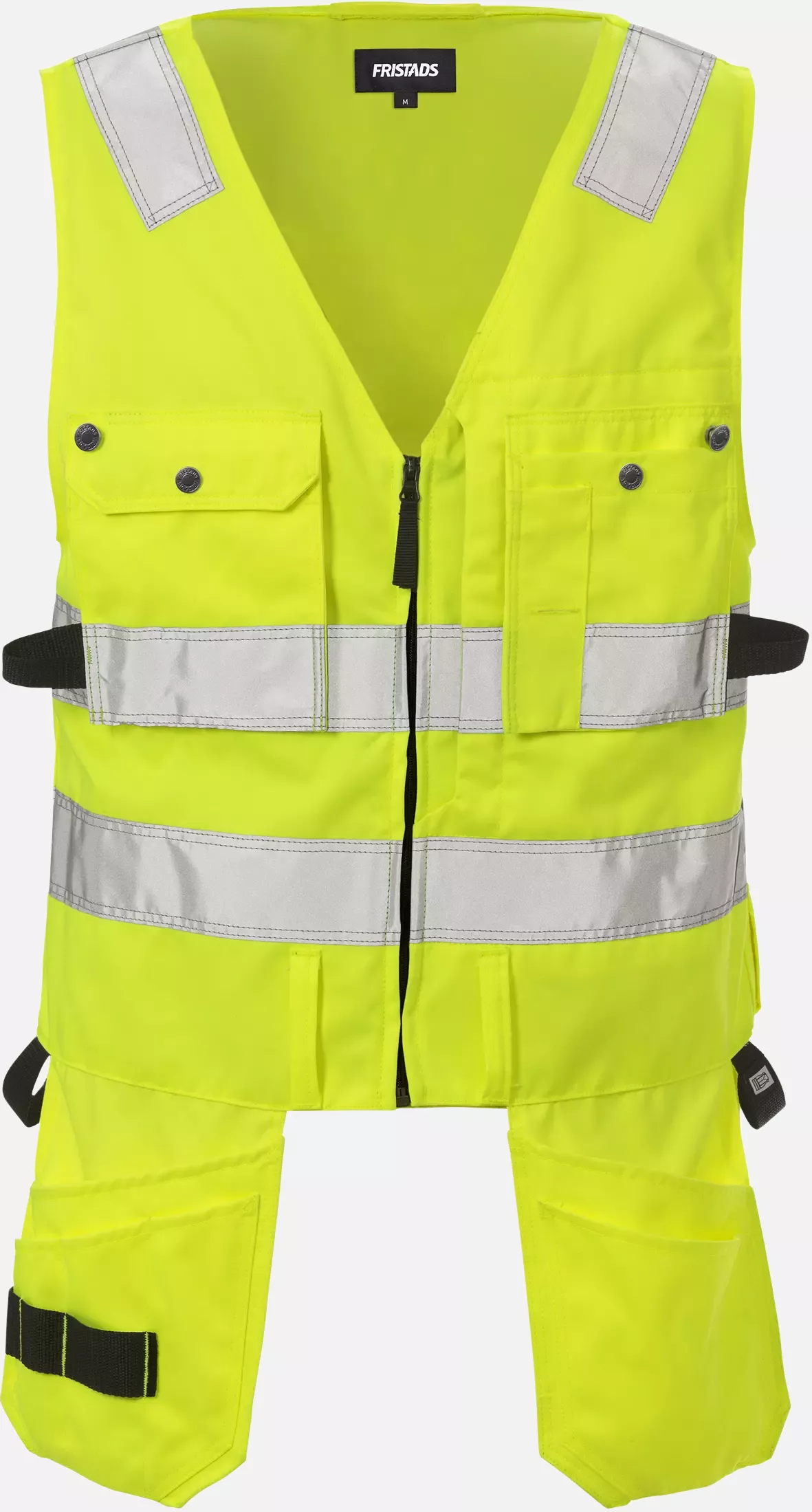 This Class 2 High-Vis vest combines sustainable materials made from recycled material and organic cotton with practical features for professional use. The vest features a width-adjustable front fastening and is equipped with CORDURA® reinforced pockets as well as various tool loops. With a back opening for safety harnesses and the option for a VAS solution, it offers versatile safety options.