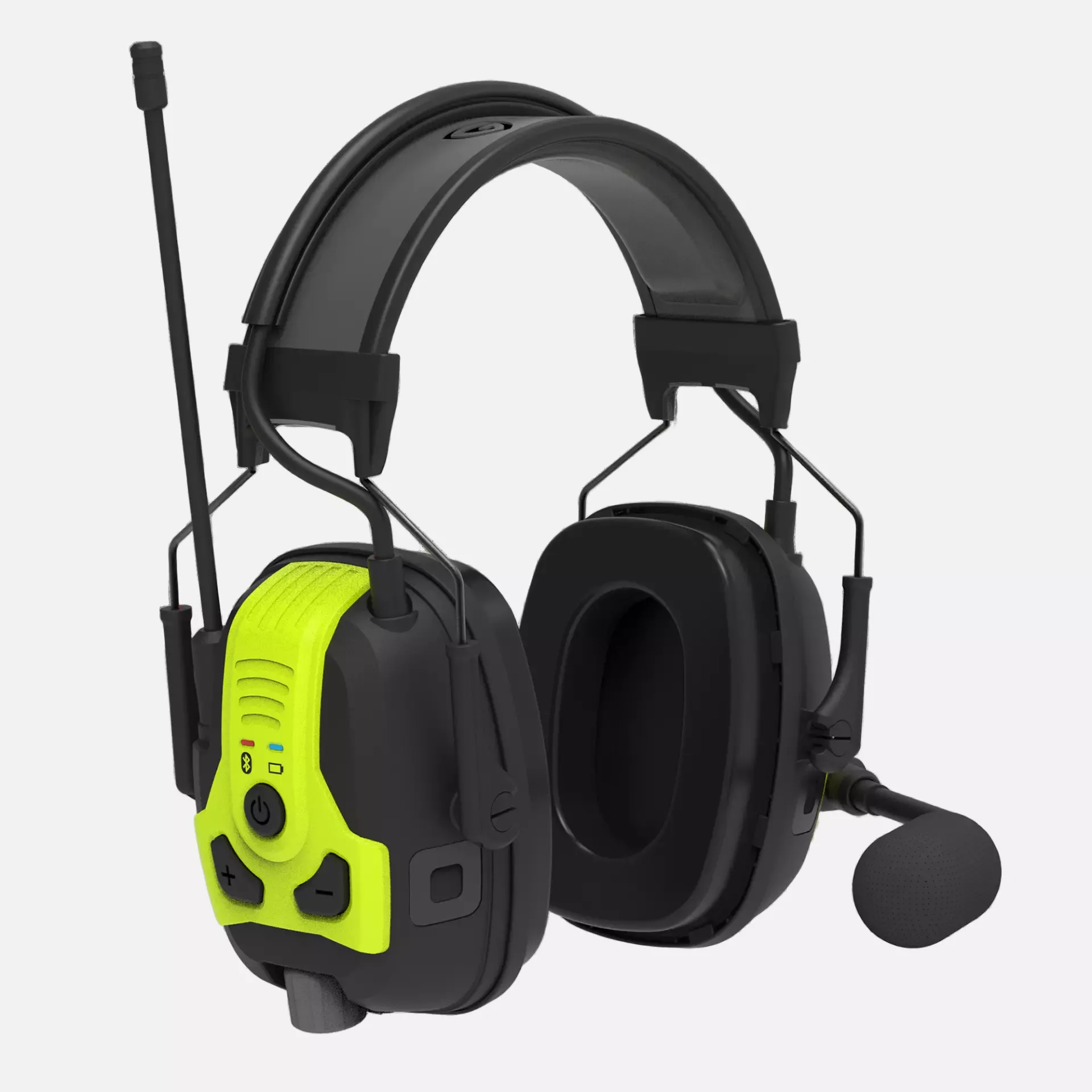 Professional hearing protection with integrated PMR/DMR communication radio featuring AI-powered voice control and Bluetooth connectivity. This SNR 32dB hearing protector combines advanced communication capabilities with flexible mounting options, allowing seamless conversion between headband and helmet use. The VoxSense technology enables hands-free radio activation through intelligent voice recognition, while dual-device Bluetooth connectivity ensures comprehensive communication management for demanding work environments.