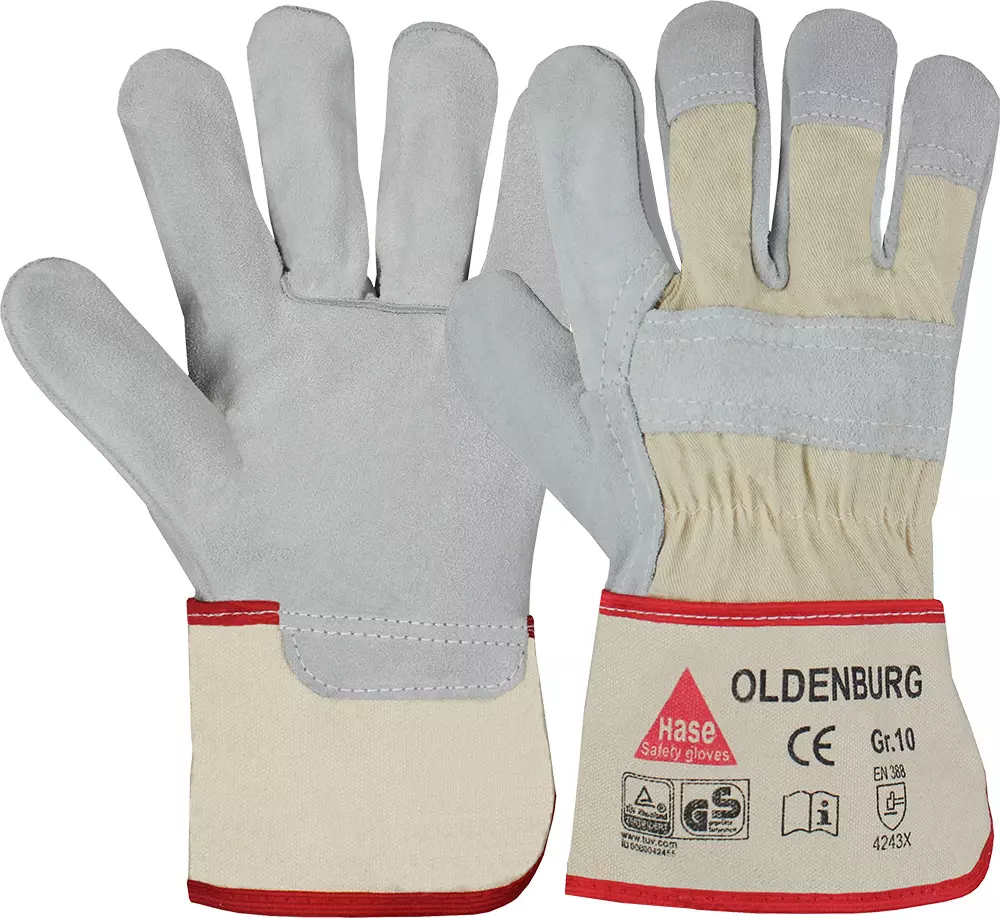 Cow split leather work glove with high wearing comfort, double seams, canvas cuff, palm lining, TÜV GS. EN 388