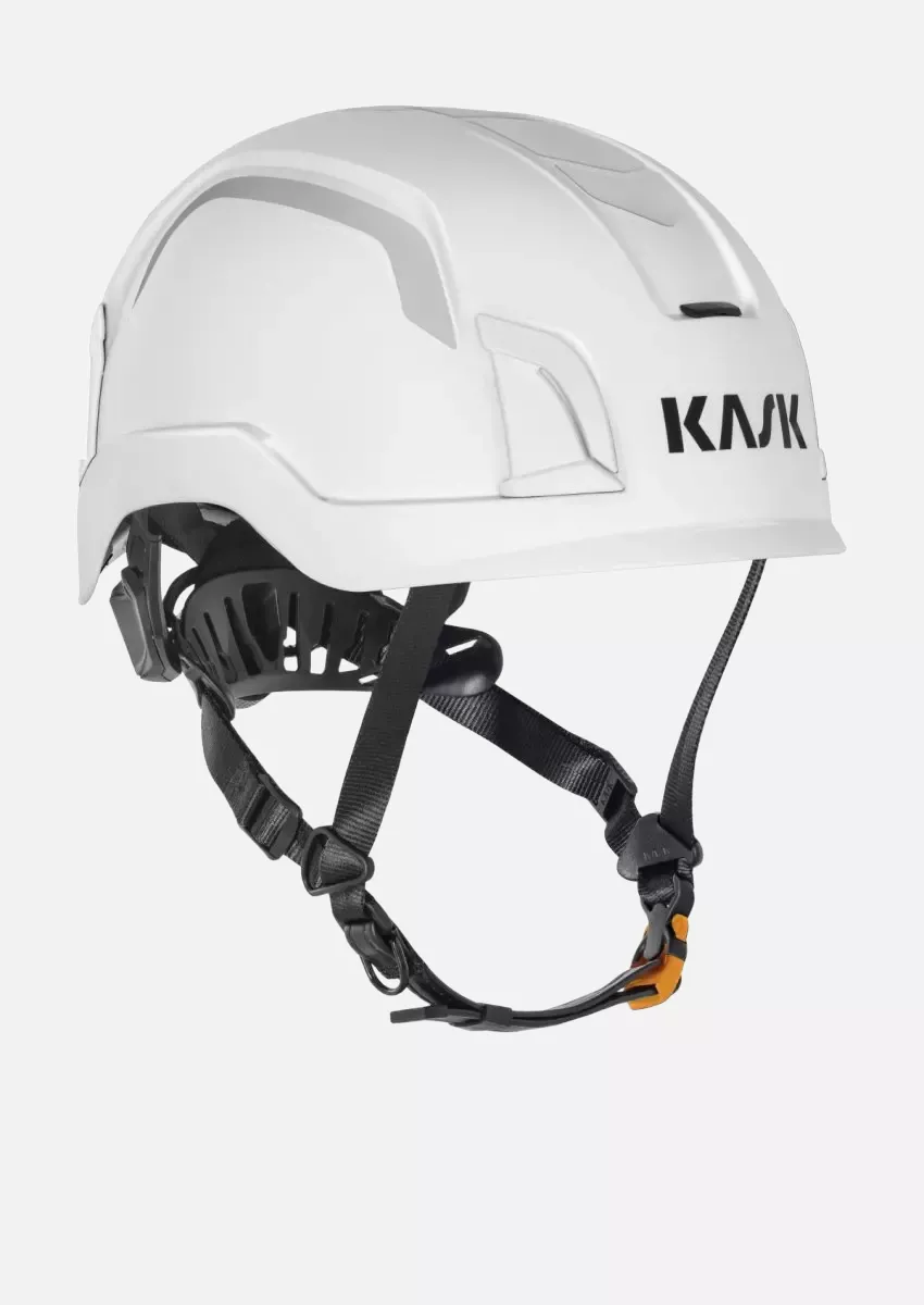 The new Zenith X HI VIZ - EN397 - EN 50365 (Class 0) from KASK is a multifunctional safety helmet with numerous accessory options for enhanced protection in high-voltage environments. It is adjustable for head sizes from 52 cm to 63 cm. The helmet's inner shell is equipped with a high-density inner core, ensuring optimal protection against impacts from above. Another highlight of this helmet is the adaptive adjustment system. A new double-diameter adjustment wheel allows for easier size adjustment. The ergonomic side wings also ensure a faster, secure fit at the back of the head. The patented Self Adaptive Live Hinge System is the latest self-adjusting technology that adapts to the wearer's movements.
