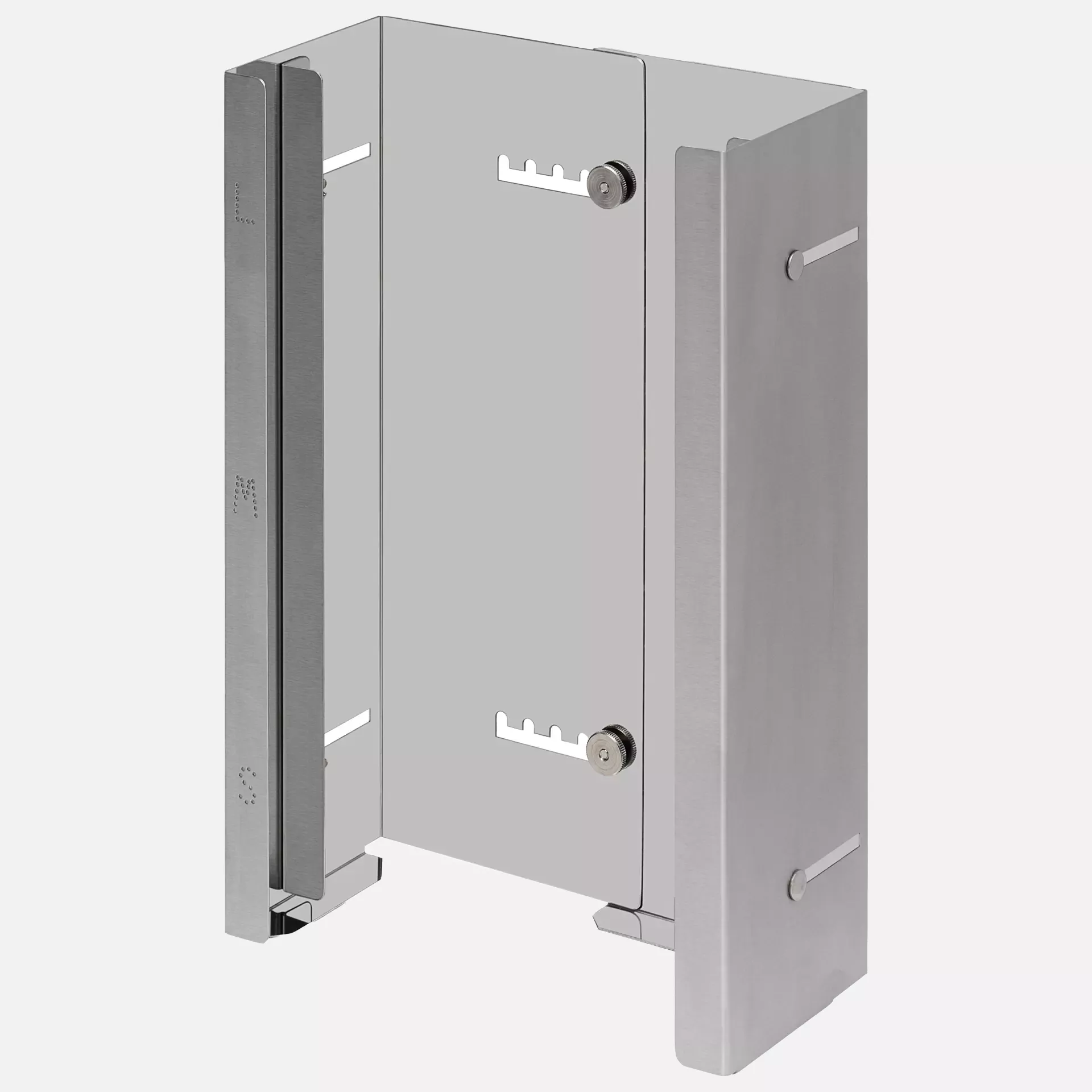Professional stainless steel glove box holder designed to accommodate three standard glove boxes with integrated size labeling. This adjustable mounting solution offers flexible width and depth settings to ensure optimal fit in various workspace configurations. Made in Germany, this holder comes complete with all necessary mounting hardware for secure installation.
