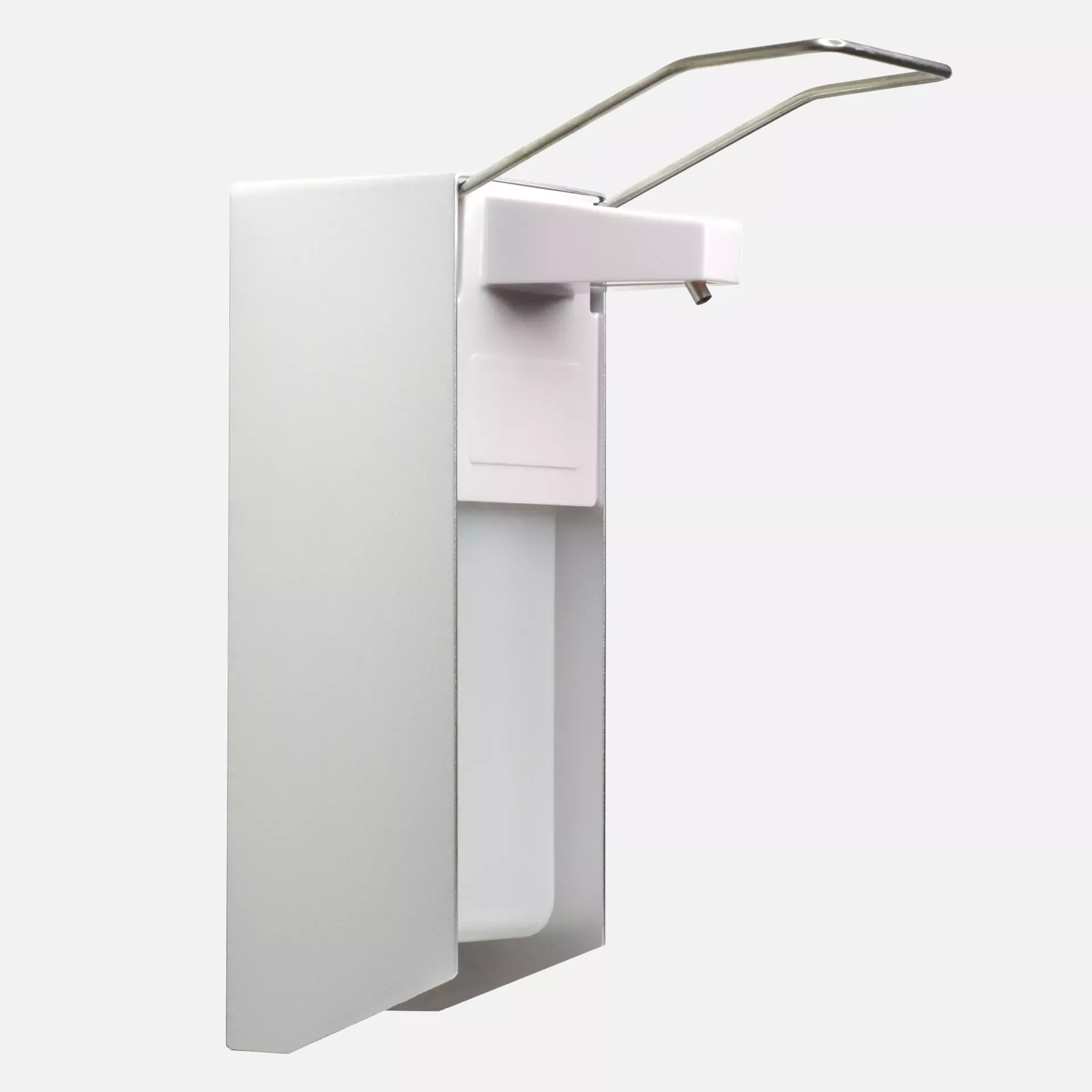 Professional wall-mounted disinfectant dispenser combining aluminum and plastic construction for durability and practical use. This hygienic solution features a convenient arm lever mechanism for hands-free operation and includes a removable pump for easy maintenance and refilling. The dispenser comes complete with wall mounting materials and offers a generous 1,000 ml capacity for high-traffic areas.