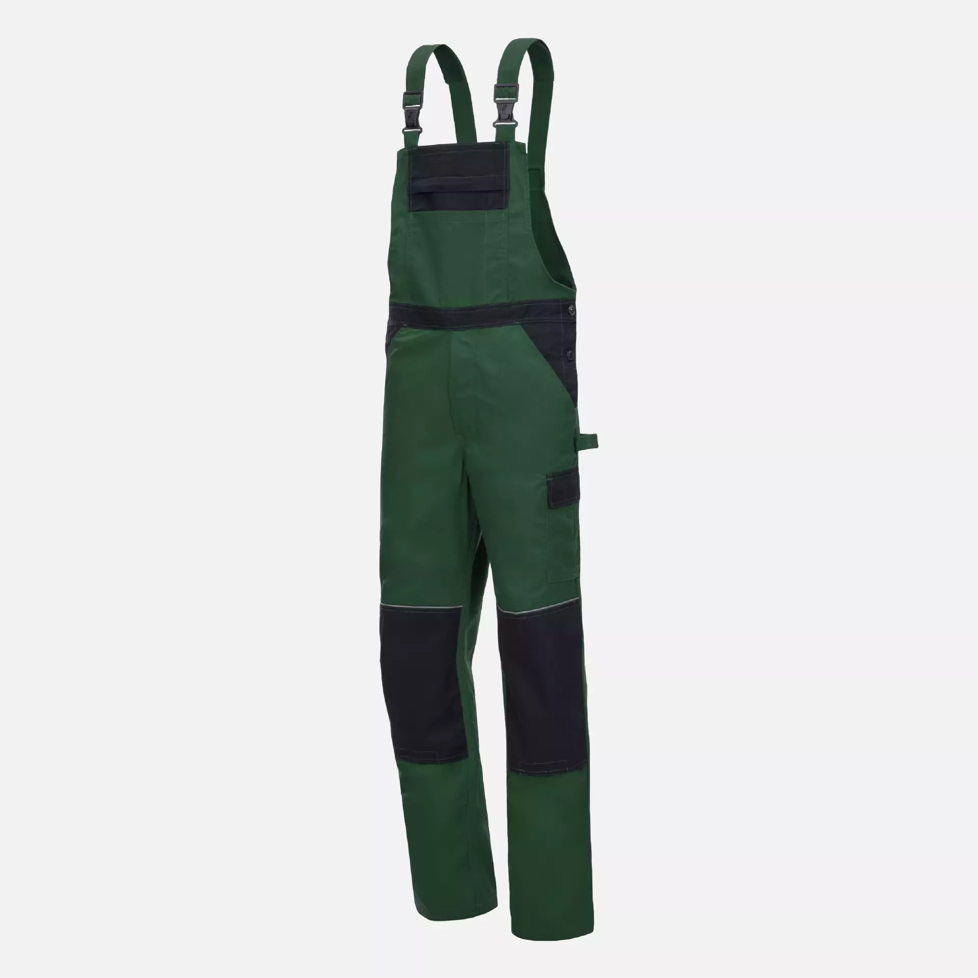 Professional bib pants designed for optimal workplace functionality and comfort, featuring a lightweight 245 g/sqm construction with strategic reinforcements at high-wear areas. These pants combine breathability with durability while incorporating reflective elements for enhanced visibility. The design includes multiple specialized pockets and practical features for tools and protective equipment, certified to STANDARD 100 by OEKO-TEX®.