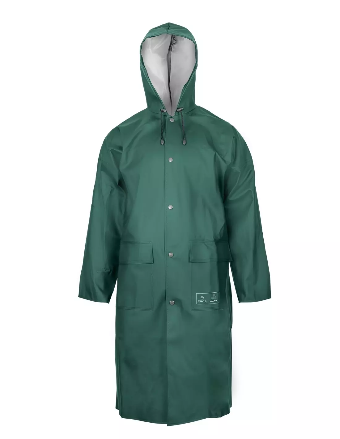 This protective coat is designed for use in adverse weather conditions, featuring an extended length to protect thighs and knees from moisture. Constructed using a double-sided welding technique for enhanced seam strength, it provides reliable protection against water penetration. The coat includes practical features such as metal snap fastening, a drawstring hood for adjustable coverage, and two front pockets with protective flaps to prevent water ingress.