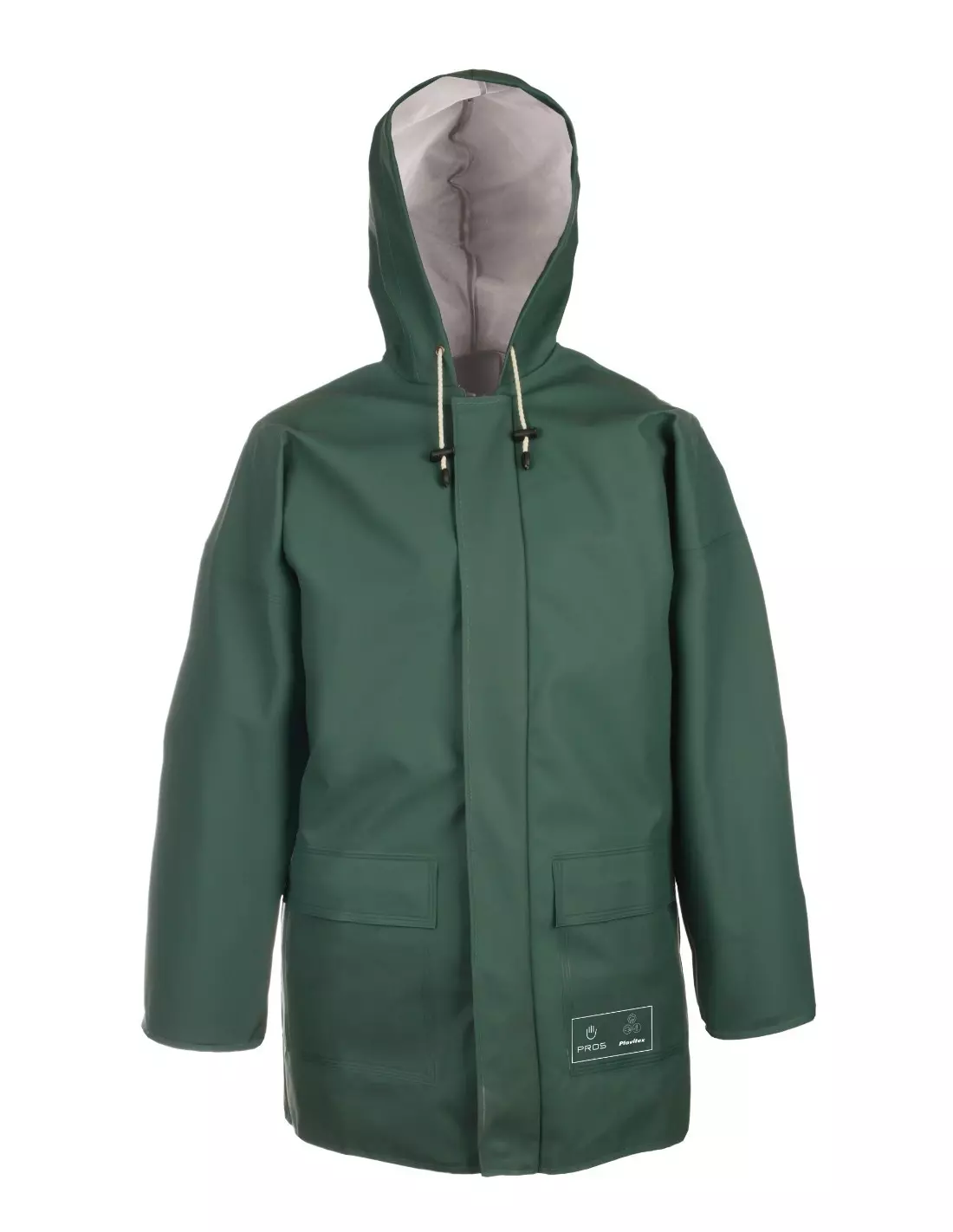 This versatile jacket provides excellent protection against wind and rain in demanding conditions. Made with PLAVITEX material featuring a polyester backing with one-sided PVC coating, it offers exceptional durability and weather resistance. The double-sided welding technique significantly enhances seam strength and waterproofing, while the covered zipper with placket provides additional protection against moisture penetration.