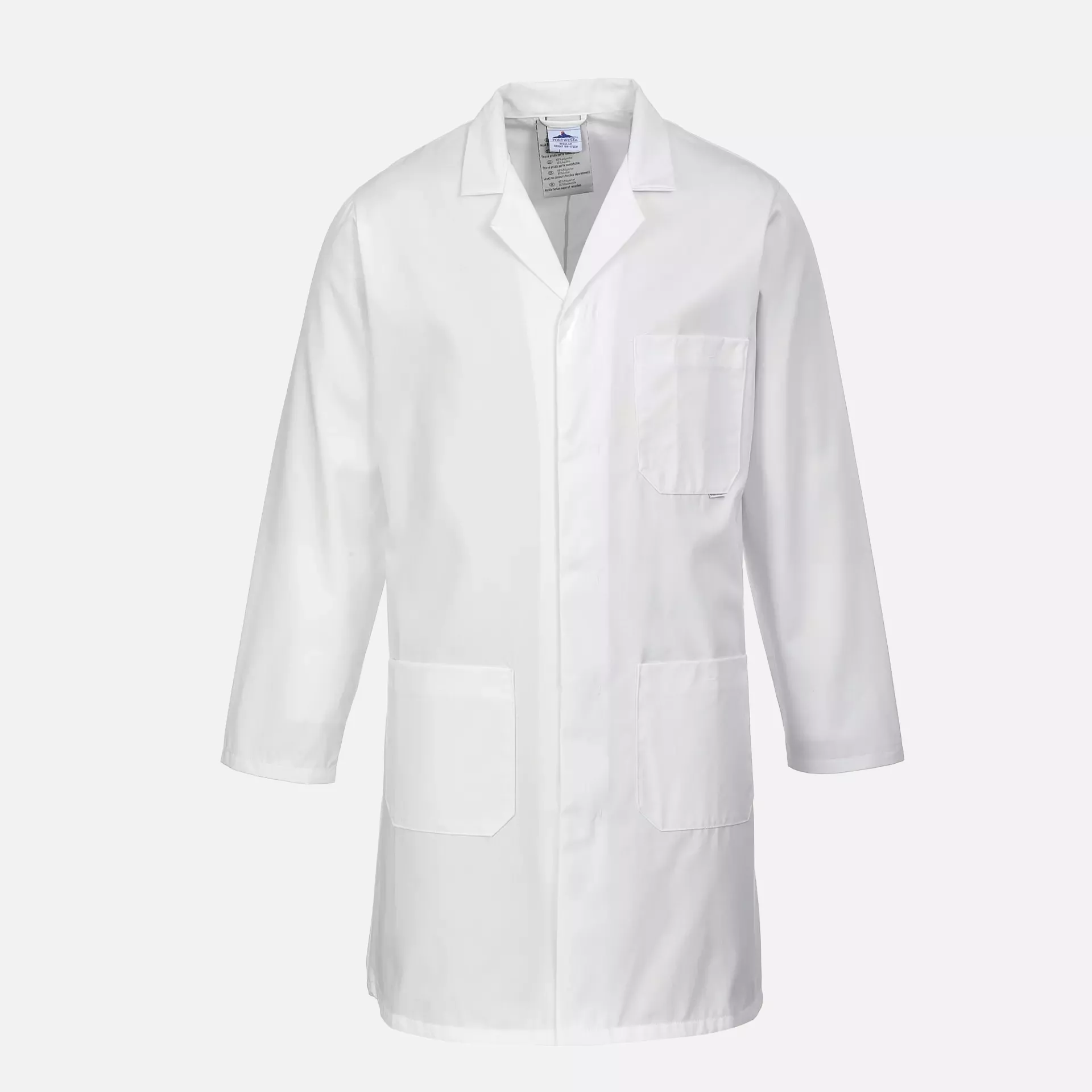 This durable work coat is constructed from Kingsmill polycotton twill fabric, designed to maintain its shape and appearance through repeated washing cycles. The garment features a concealed stud front closure and three strategically placed pockets for practical storage needs. With excellent dye retention properties and machine washability at 60°C, this coat offers reliable performance for professional environments.