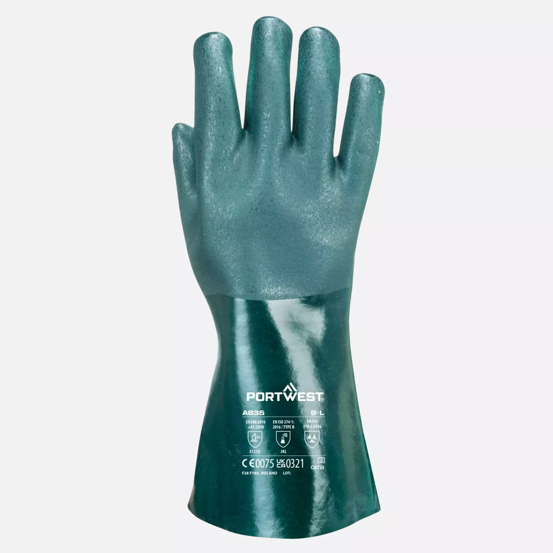 Professional chemical-resistant gauntlet featuring double-dipped PVC construction with a sandy palm finish for enhanced grip performance. The jersey lining provides wearer comfort during extended use, while the 1.6mm thickness offers reliable protection against chemicals and microorganisms. This phthalate-free gauntlet meets multiple safety standards including EN ISO 374 Type B certification for chemical protection.