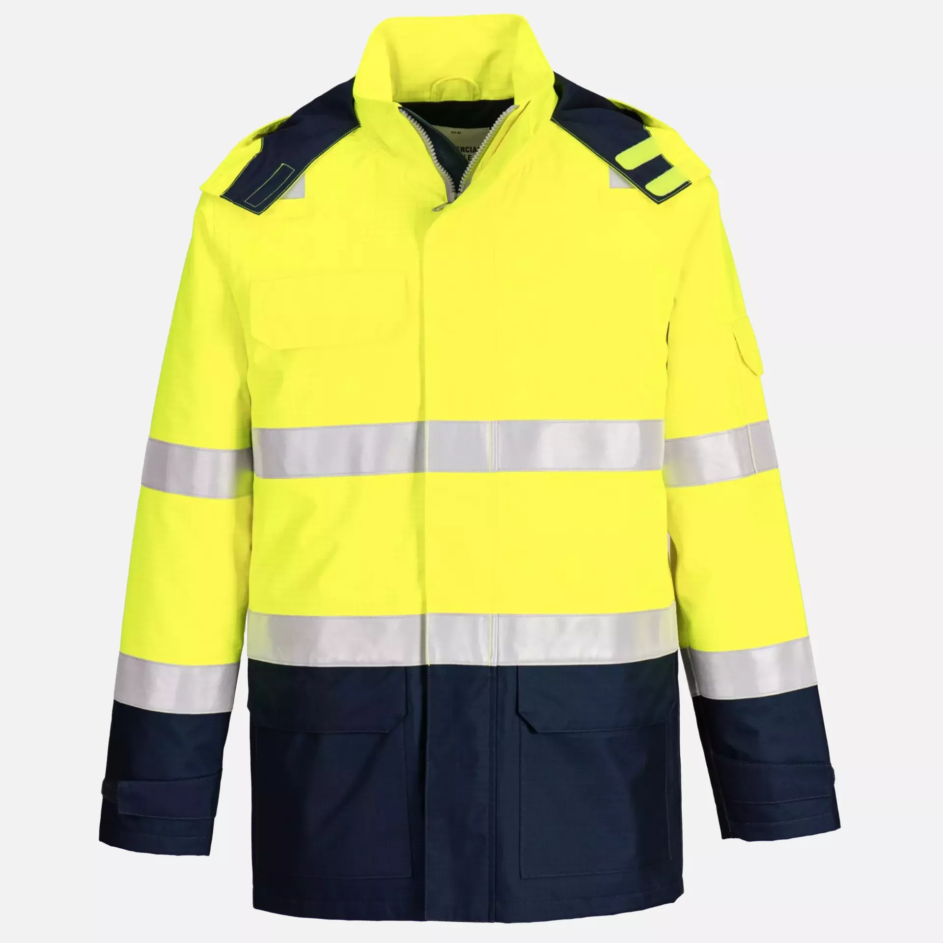 This multi-norm flame resistant jacket provides comprehensive protection against fire, chemicals, rain, and arc flash hazards while maintaining high visibility standards. The waterproof fabric with FR cotton lining offers protection from radiant, convective and contact heat while ensuring comfort and warmth in adverse weather conditions. With an ergonomically shaped hood and multiple practical features, this jacket is designed for demanding industrial environments requiring versatile protection.