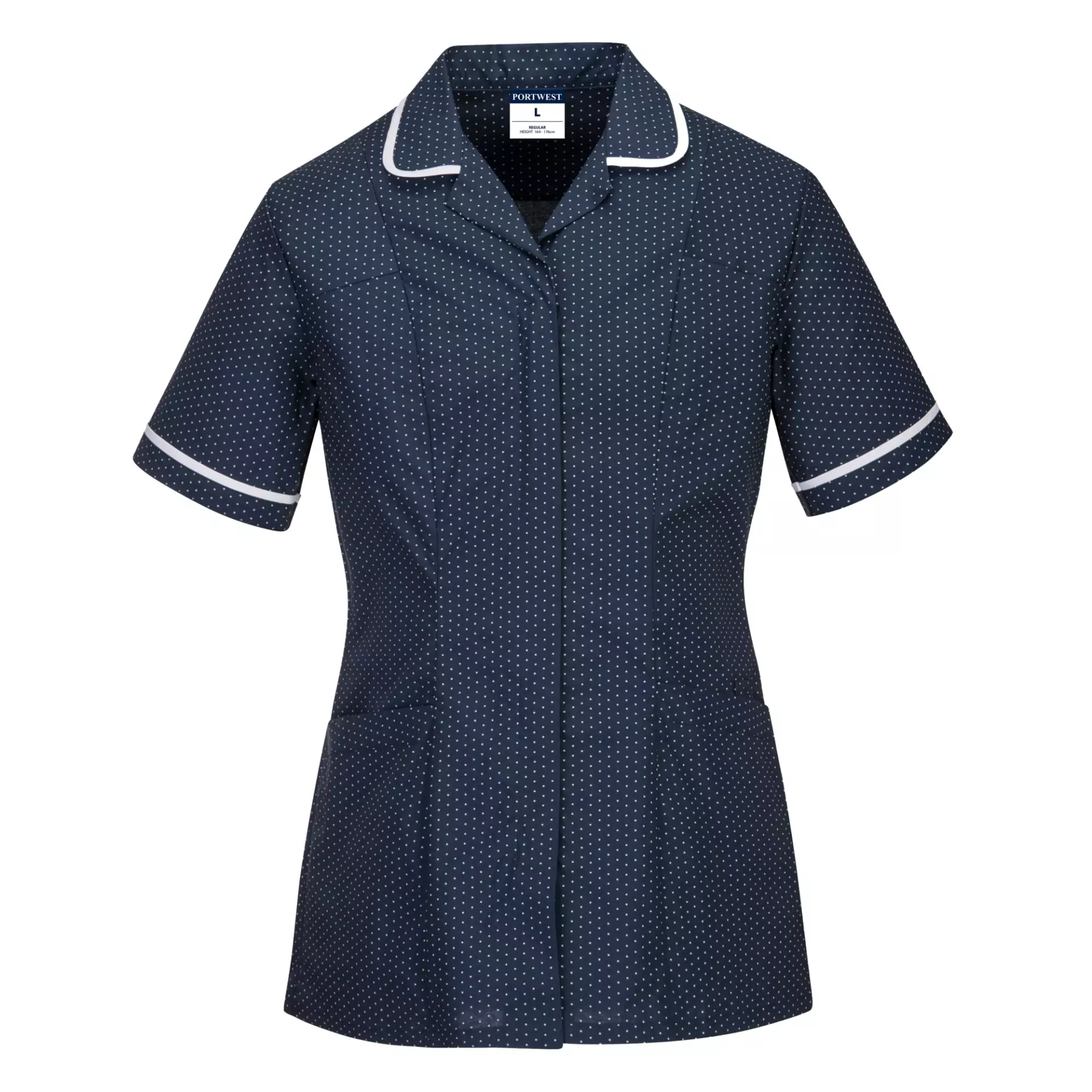 This women's garment features 2-way twill stretch fabric and an action back design for enhanced mobility and comfort during active use. The practical design includes multiple storage solutions with three standard pockets, a concealed scissors pocket, and a waterproof pocket for secure storage. Machine washable at 60°C for easy maintenance.