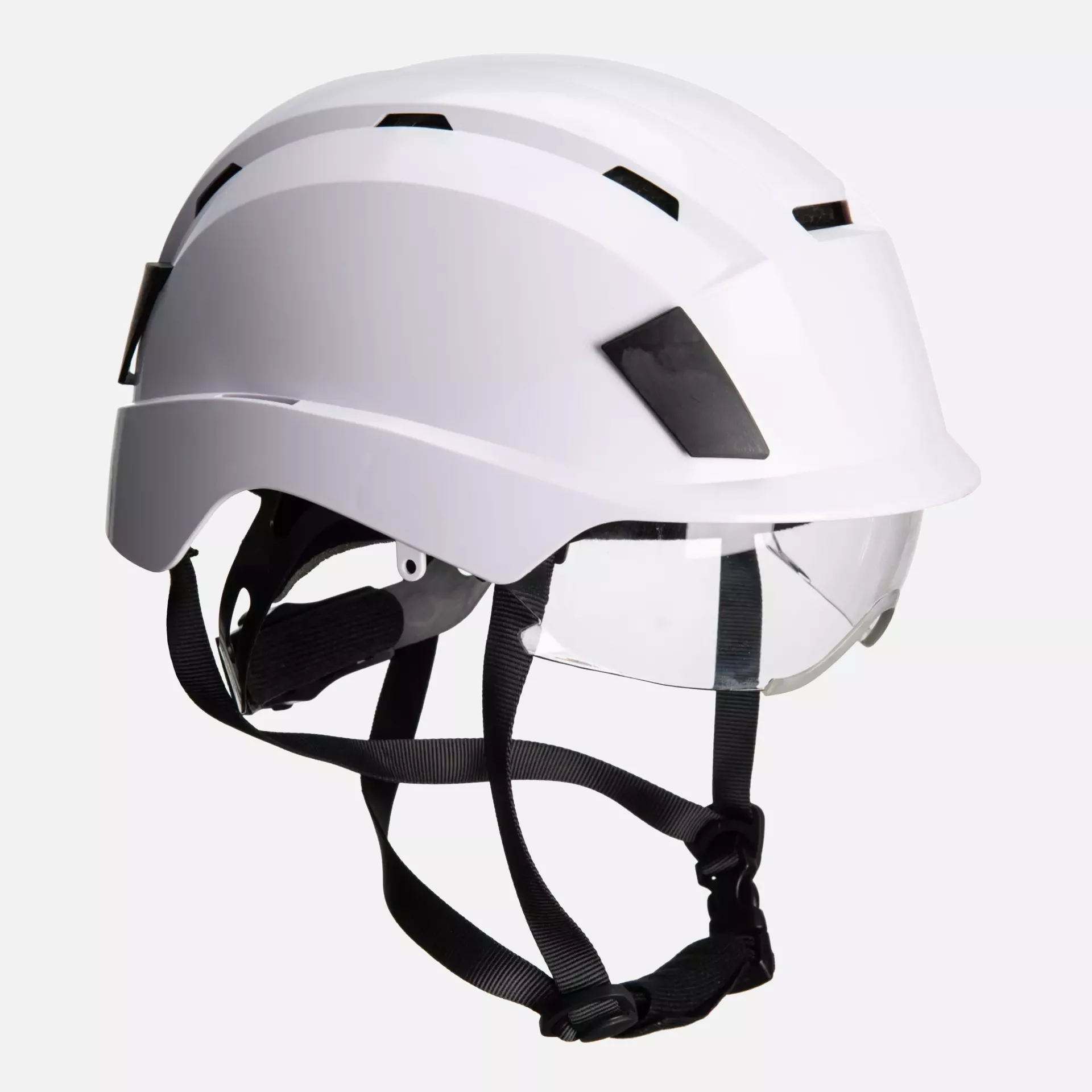 This safety helmet features an integrated visor that retracts safely into the helmet shell when not in use, providing convenient protection and storage. The ventilated design promotes airflow for cooling comfort, while EPS foam padding enhances both safety and wearer comfort. Dual certification under EN 397 and EN 12492 standards ensures versatility across different safety applications.