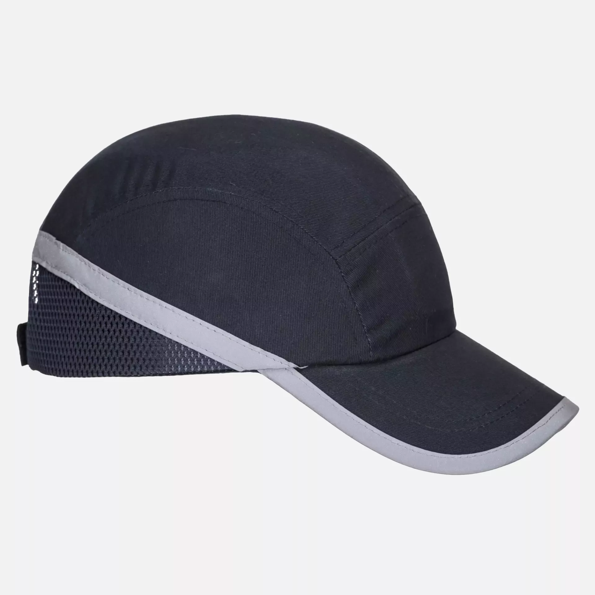 Modern style bump cap featuring a 7cm long peak designed for protection from glare and impact. The cap incorporates high density EVA material with an inner ABS shell for durability and shock absorption, while mesh panels and ventilation holes provide cooling comfort. Hook and loop adjustment ensures a secure fit with padded headband for enhanced comfort.