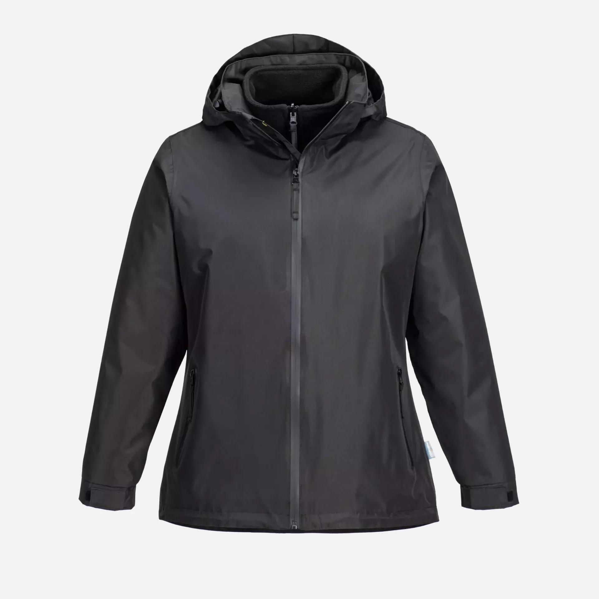 This waterproof, windproof and breathable 3-in-1 jacket features an interactive fleece system that allows the inner layer to be worn separately for versatile use. The jacket incorporates PFAS-free Texpel™ Splash Eco fabric finish for water resistance, with taped seams and exposed waterproof zips providing comprehensive weather protection. Designed with a women's fit, it includes practical features like adjustable cuffs and hem, detachable hood, and multiple pockets for storage and corporate branding access.