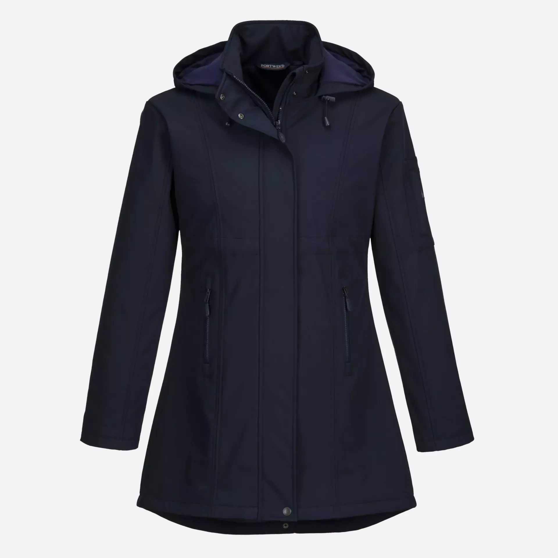 The Carla Hooded Softshell Jacket combines professional appearance with technical weather protection through its 3-layer softshell construction. Featuring PFAS-free Texpel™ Splash Eco fabric finish, this jacket offers 8,000mm waterproof rating and 3,000g/m²/24hr breathability for reliable performance in adverse conditions. The tailored design includes practical elements like adjustable waist, storm flap protection, and multiple storage pockets for professional environments requiring both style and functionality.