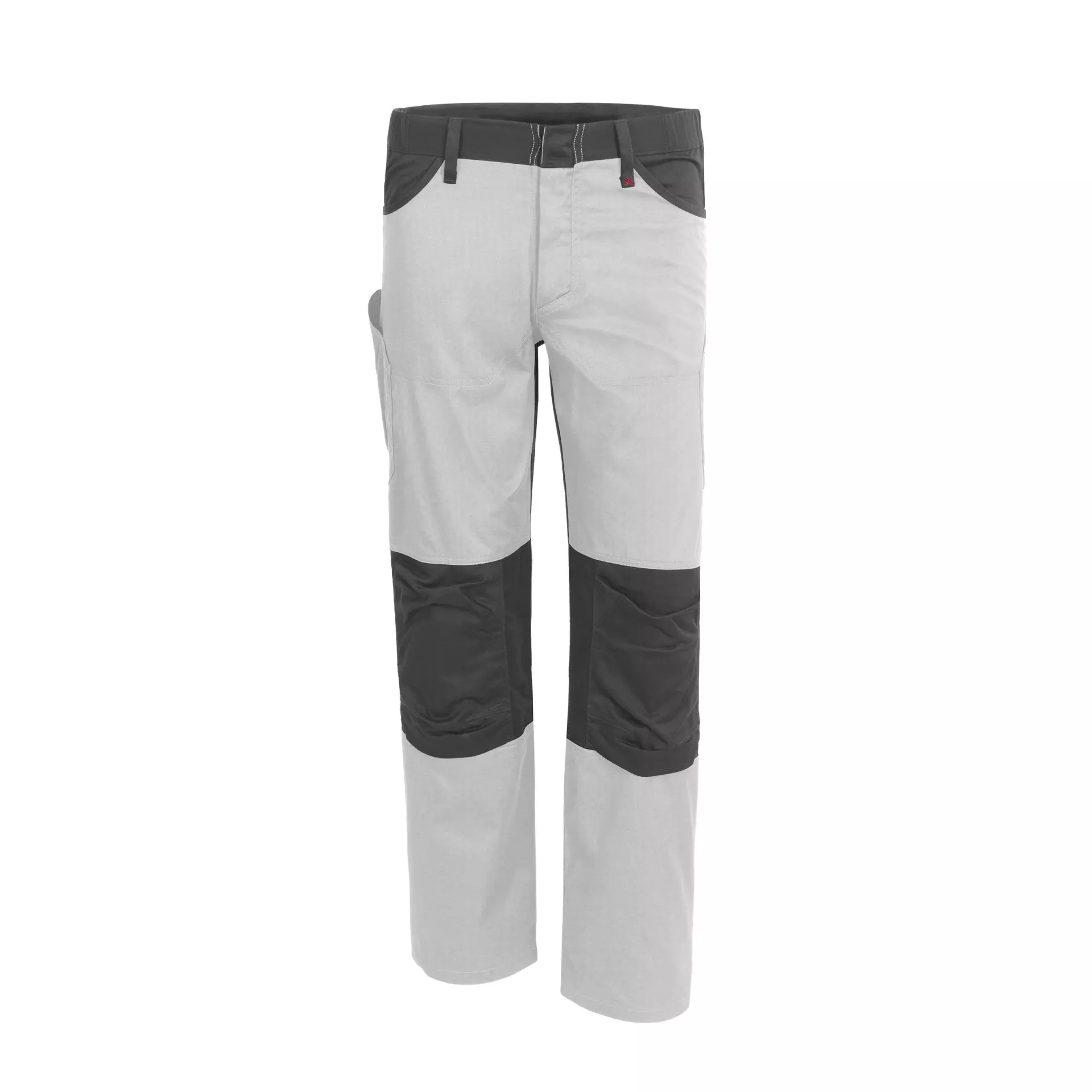 Waistband with 6 belt loops, side elasticated waistband, 2 large side pockets extending into the back and separated by a side seam: resulting in a large back pocket on the right up to the seat seam and a smaller pocket on the left, fly with plastic zip and waistband closure with metal jeans button, pre-formed knee pad pocket, knee pad insertion from below, X-bar tacks partly in red, partly tone-on-tone, ruler pocket on the right with divider for pen compartment, patch thigh pocket on the left (without closure)
