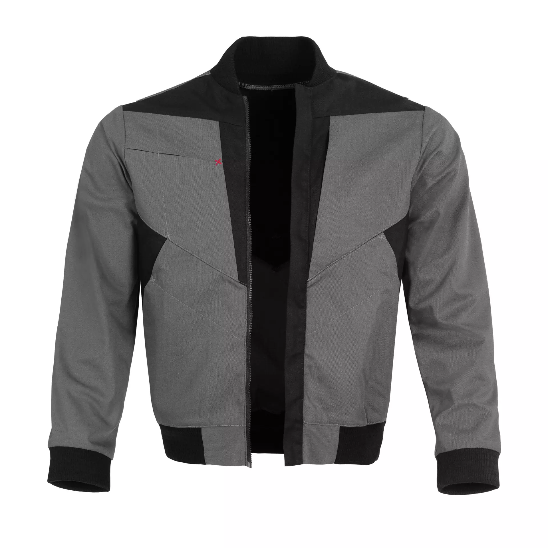 Round neckline with ribbed collar, pointed attached back yoke, reflective piping on the sides, back section extending to the front simulating a chest yoke, concealed front plastic zipper, one inset Napoleon pocket on the left chest with plastic zipper, patch pocket with pen compartment on the right chest, 2 patch side pockets with slanted entry and individual partition for a smaller additional pocket each, X-tacks partly in red, partly tone-on-tone, sleeve ends with ribbed cuffs, hem with ribbed waistband