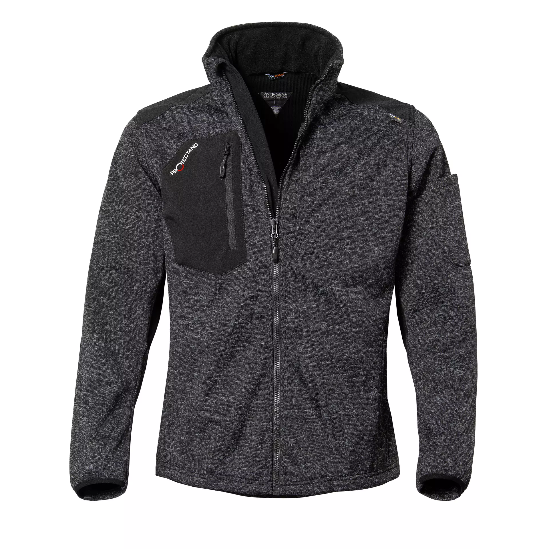 Stand-up collar with concealed, removable hood, hood with drawstring, front zip with Softshell chin guard, shoulder area reinforced with Cordura, one patch chest pocket with zip on the right front, patch pocket on the left upper arm, two inner pockets, Cordura reinforcement at the elbow, Softshell insert from the back of the elbow to the hip, Material: 100% polyester, Weight: approx. 425g/m²