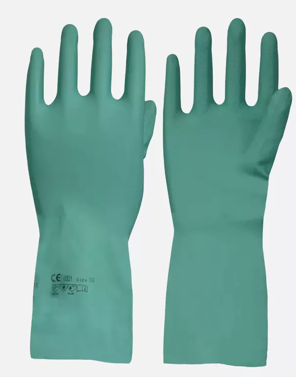 Nitrile TOP Green Flock Lined, suitable for food contact. With waffle pattern on the palm. Length: 33cm.