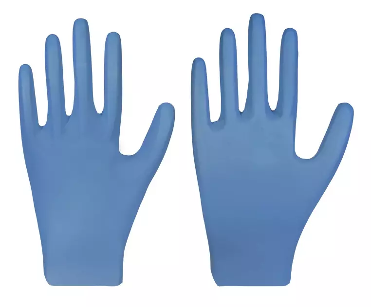 Disposable nitrile gloves in blue color, packed in a box with 200 pieces. The wall thickness of the palm is 0.06 mm /- 0.02. The weight per glove in size M is approx. 2.2g. The gloves are food-safe, powder-free, non-sterile and can be worn on both sides. The rolled edge is fingertip-rough and textured. The gloves are free from natural latex and are 24 cm long.