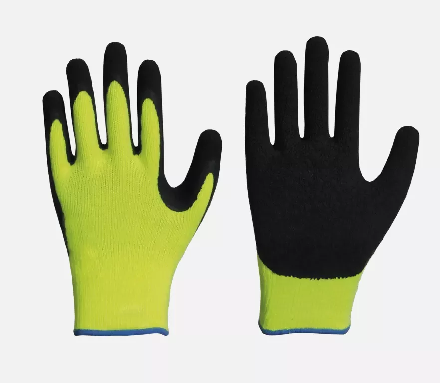 10 gauge knitted glove made of internally brushed acrylic loop fabric and black crinkle latex coating. Offers good cold protection as well as wet and dry grip.