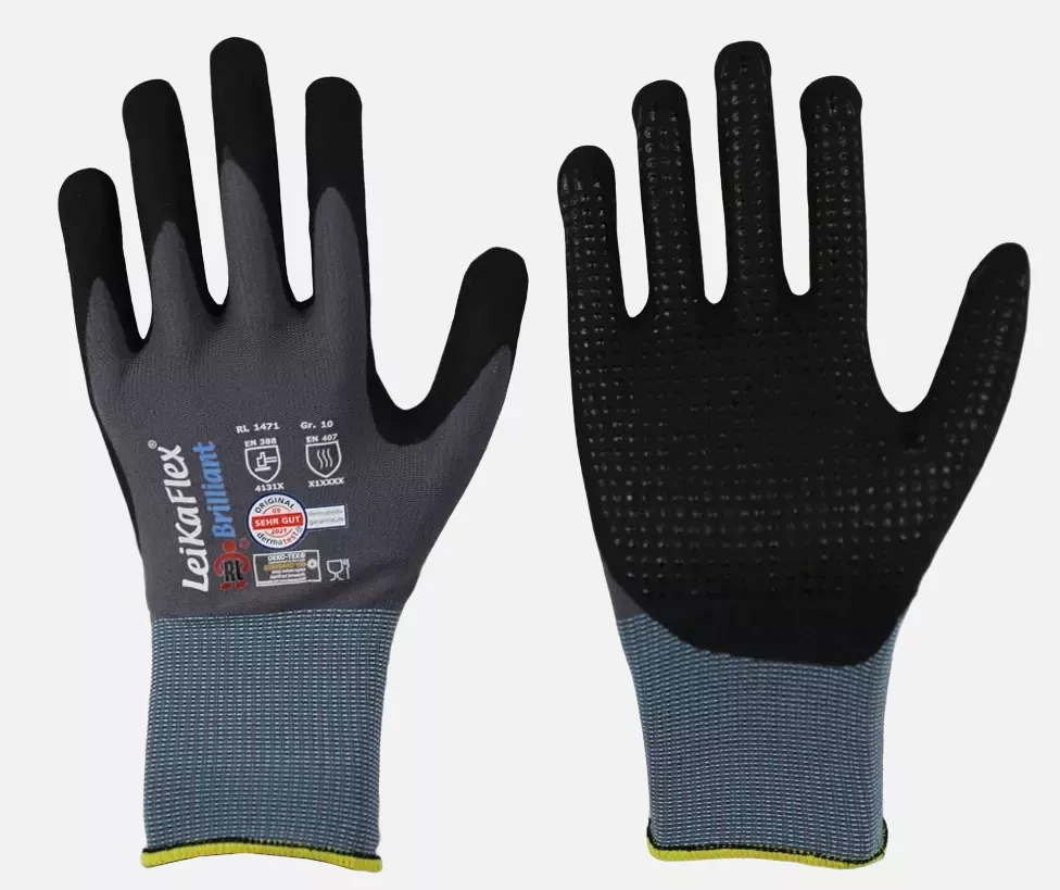 The LeiKaFlex® - Brilliant glove is manufactured according to three standards: Comfort, performance grip durability, cleanliness gentle on skin and the environment. The fit and feel are improved by the NFT® coating (NFT = New Foam Technology), which penetrates halfway into the liner so that only the soft liner lies on the skin. The micro-capillary tube structure ensures breathability and excellent grip on all surfaces. The glove is durable and suitable for short-term contact with dry food and indirect food contact.