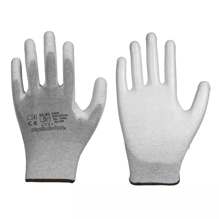 Fine knit glove made of polyester, combined with a carbon fiber anti-static coating in accordance with EN 16350, offering optimum tactile sensitivity, a perfect fit and very good grip thanks to the PU coating in accordance with EN 388 and EN 16350.