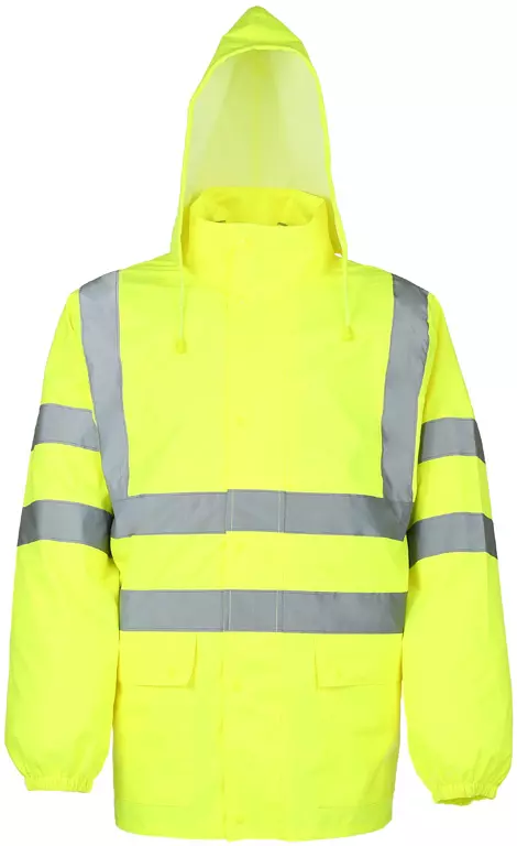 Wind- and waterproof welded seams, two side pockets with snap button cover, front zipper with snap button closure, hood with drawstring in collar, sleeve hem with elastic band, reflective stripes around body, sleeves and shoulders, material: 100% polyester Oxford with PU coating, color: neon yellow, EN ISO 20471 class 3 / EN 343 class 3/1/X, free space for logos etc.: 0.28 m² = 2,800 cm².