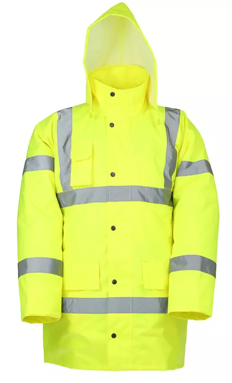 Lined rain parka with windproof and waterproof coating, taped seams, two side pockets, cell phone pocket, inside pocket, covered front zipper with press stud fastener, hood with drawstring in the collar, knitted cuffs in the sleeves, all-round reflective stripes on the body, sleeves and shoulder area. Outer material made of 100% polyester oxford with PU coating, lining and filling made of 100% polyester. Color: neon yellow. Complies with EN 20471 class 3 and EN 343 class 3/1.