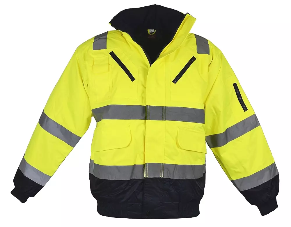 The pilot jacket has reflective stripes, a rolled-up hood and a comfortable fleece trim in the collar. There are many optimally arranged inside and outside pockets as well as sleeves with knitted cuffs and a covered zipper. The outer fabric is made of 100% Oxford polyester and is PU-coated on the inside. The lining is made of 100% polyester and the filling is made of 100% polyester wadding. The color is neon yellow/navy and there is a free area of 0.08 m² = 800cm² for logos and the like.