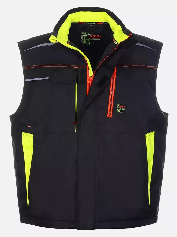 Modern quilted vest from the BLACK LINE series by Leipold-Workwear for professionals. The vest is windproof and water-repellent in black with coloured accents (neon yellow/luminous orange). It features a pleasantly warming inner lining and fleece trim in the collar. The concealed front zip has a chin guard and a storm flap with Velcro fastening. There is an inner pocket with Velcro, a left chest pocket with a coloured zip, and a right chest pocket with a flap and Velcro fastening. The shoulder areas are made of robust polyamide fabric, and the hem width is adjustable via a drawstring. Additionally, there are 2 patch side pockets with zips and various subtle reflective piping details. The outer material consists of 100% Oxford polyester with PU coating, the shoulders of 100% Oxford polyamide with PU coating, the padding of 100% polyester wadding (140 g/m²) and the lining of 100% polyester.