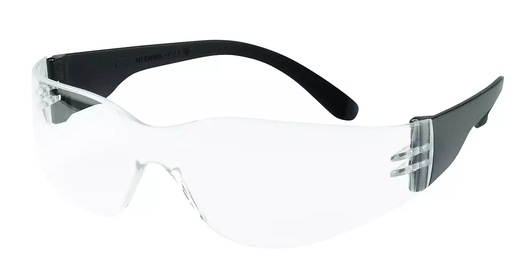 Sporty safety spectacles with high-quality anti-fog lenses and a frameless, modern design. They offer an optimum field of vision and UV 400 sun protection. The clear lens (2 mm) is scratch-resistant and has an anti-fog effect. The black frame is also very suitable for children and people with small head sizes.