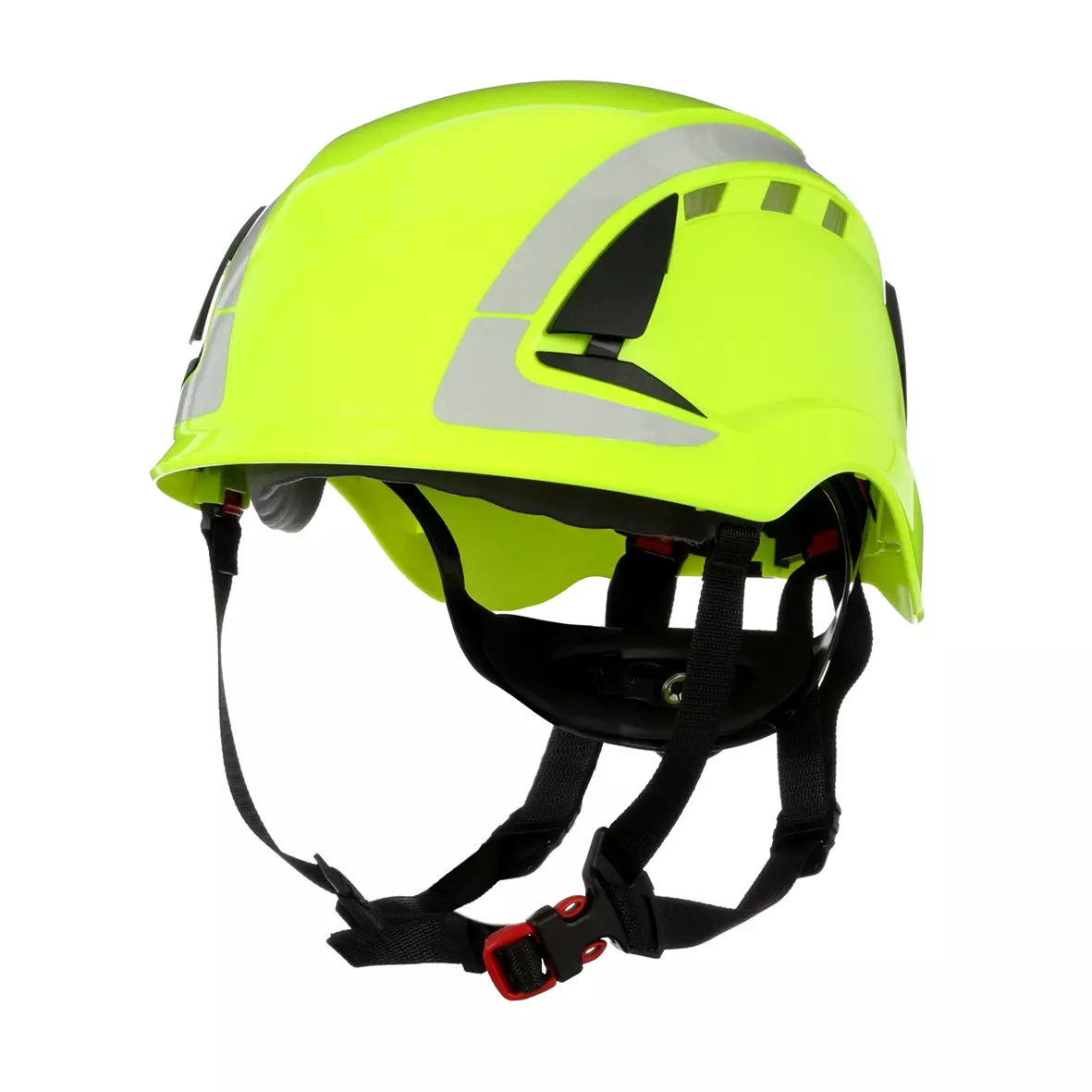 Safe and comfortable head protection for work at height or hazardous work in industry. The helmet has been tested for lateral deformation and is made of UV-stabilized ABS. It is available in neon green and has a strap system with exclusive, patented 3M pressure distribution technology. The unique changeover system developed by 3M on the 4-point chin strap allows you to switch between the EN 12492 (mountaineering helmets) and EN 397 (industrial safety helmets) standards. The 6-point ratchet closure system allows the wearer to adjust the helmet height and fit with multiple vertical adjustment options. A magnetic fastening clip is provided as standard. The rimless design, based on the climbing helmet, allows an unobstructed view upwards. The notches and brackets are compatible with a wide range of 3M(TM) visors, ear muffs and other accessories. The patented UV indicator lets the wearer know when the helmet has been exposed to excessive UV and should be replaced. The helmet is certified to EN 12492 or EN 397 (depending on the adjustment of the chin strap).