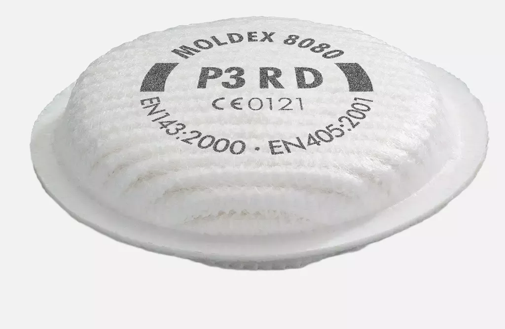 The P3 R D particle filter in accordance with EN 143: 2000 meets the requirements of the additional dolomite dust test and is compatible for use in System Series 8000 and Series 5000 half masks. It meets the requirements of EN 143: 2000 A1: 2006 and protects against harmful water- and oil-based dusts and aerosols as well as against CMR substances, radioactive particles, enzymes and airborne biological agents in risk groups 2 and 3.