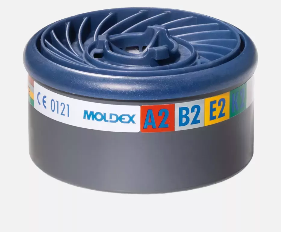 Gas filter A2B2E2K2 according to EN 14387: 2004 A1: 2008 is compatible for use in the half masks of the system series 7000 and full face masks series 9000. There is an exception if A2B2E2K2 is used in combination with P3 or P2 filters, then it is only intended for use with the full face mask series 9000. The A2B2E2K2 gas filter can be connected directly to the mask body. It is a multi-range filter against organic, inorganic, acid gases and vapors as well as ammonia (maximum concentration 0.5% by volume) and is similar to the ABEK1 filter, but is suitable for higher concentrations.