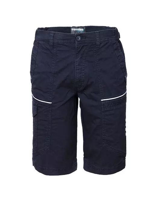Professional work bermuda shorts crafted from durable 240 g/m² stretch twill fabric, featuring multiple specialized pockets for enhanced utility. These shorts combine practical functionality with safety elements through reflective fabric details and reinforced construction. The design incorporates elastic sides and belt loops for improved comfort and fit during work activities.