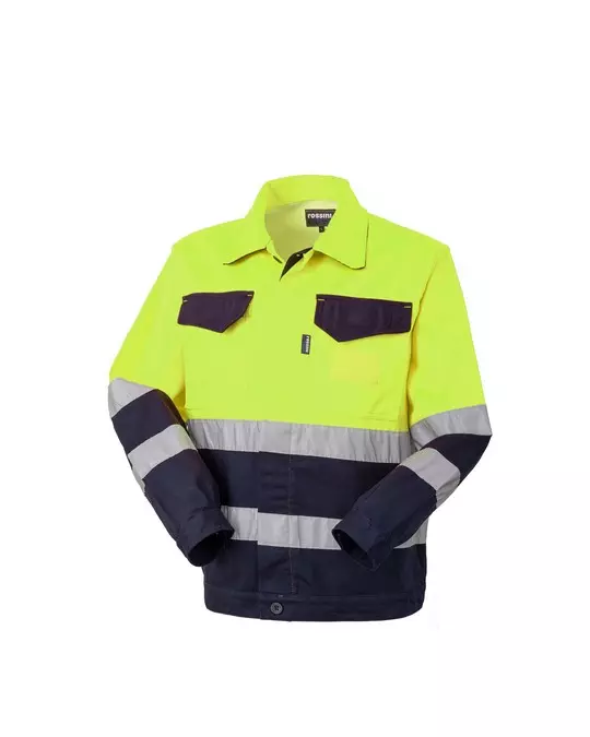 Professional high-visibility winter jacket featuring a practical concealed button closure and comprehensive safety elements. This jacket combines durability with functionality through its moleskin base construction and strategic reflective strips. The design incorporates multiple specialized pockets and adjustable features for workplace convenience and safety compliance.
