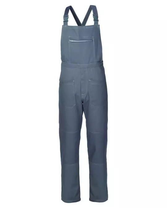 Professional work dungarees crafted from durable 280 g/m² non-shrink cotton featuring an ergonomic design with crossed braces and elastic waist for enhanced comfort. Multiple functional pockets and a tape measure holder provide convenient storage for tools and essentials. The Drill 3/1 construction ensures durability for demanding work environments.