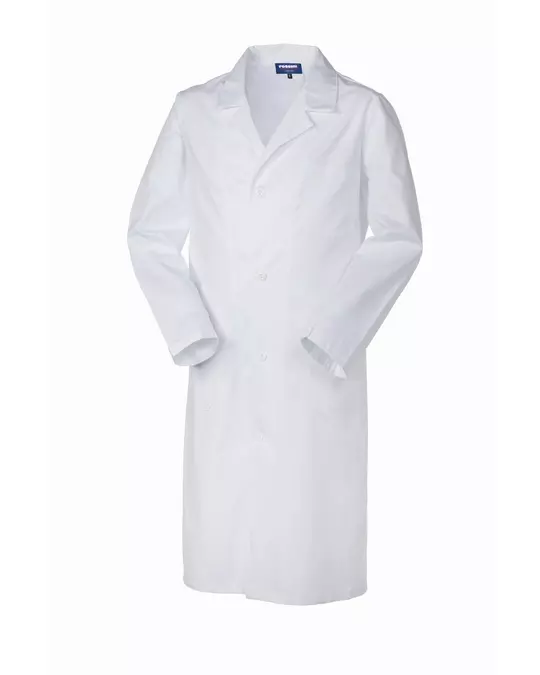 Professional laboratory coat crafted from 200 g/m² non-shrink cotton gabardine fabric. This functional design features multiple storage options with three patch pockets and a sophisticated back construction including a two-piece half belt with central buttons. The coat provides comfort and practicality with its button-front closure and back slit.