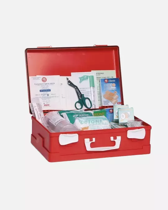 Professional-grade first aid station designed for companies and production units with three or more workers in groups A and B. This comprehensive kit comes in a durable polypropylene case featuring a wall mounting bracket, carrying handle, and secure rotating clip closure system. Compliant with Min. Decree 388 dated 15.07.03, this kit contains all essential medical supplies for workplace emergencies.