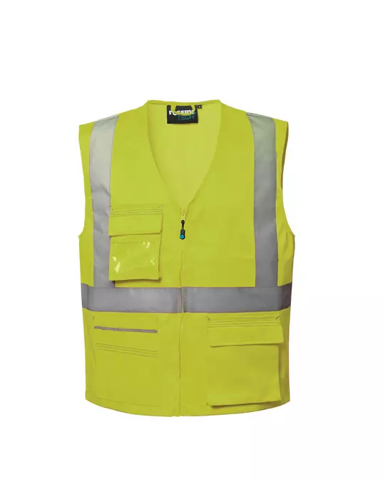 This high-visibility safety vest combines functionality with essential visibility features for workplace safety. The garment features multiple secure storage options with Velcro closures and an integrated badge holder for identification. Constructed from a durable cotton-polyester blend with strategic reflective striping, this vest ensures visibility while maintaining comfort during wear.