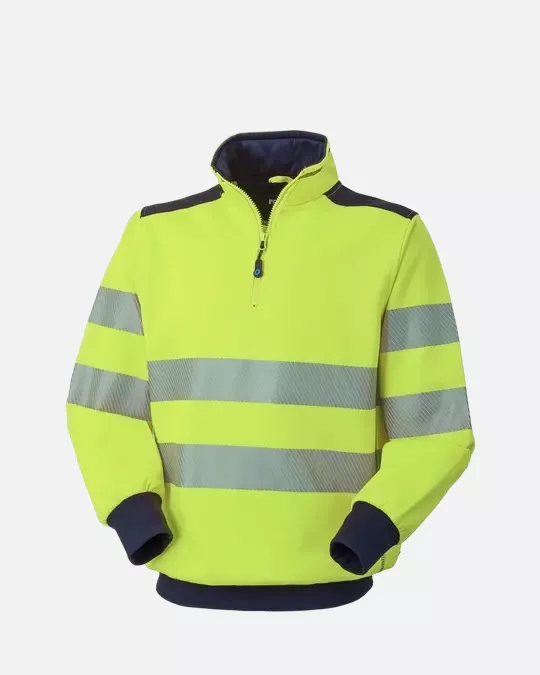 This high-visibility sweatshirt combines safety and comfort with its reflective diagonal bands and brushed cotton construction. The 280 g/m² garment features a high neck design with a short plastic zip closure and strategic reinforcements for enhanced durability. Engineered with both functionality and wearer comfort in mind, it incorporates elastic knitted elements and protective features suitable for professional environments.