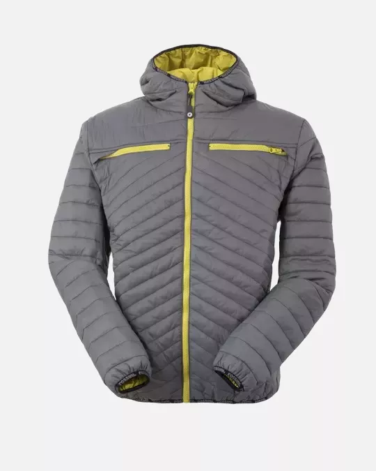 This versatile padded jacket combines functionality with sustainable materials, featuring recycled polyamide exterior and recycled polyester wadding. Multiple storage options include breast pockets, welt pockets, and interior compartments, while elastic trim ensures a secure fit. The jacket's thoughtful design incorporates various closure types including zippers, snap buttons, and Velcro for maximum utility.
