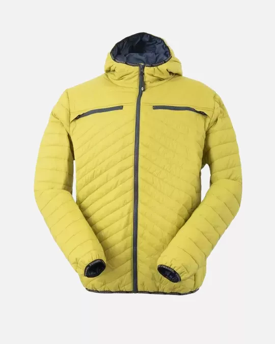 This versatile padded jacket combines functionality with sustainable materials, featuring recycled polyamide exterior and recycled polyester wadding. Multiple storage options include breast pockets, welt pockets, and interior compartments, while elastic trim ensures a secure fit. The jacket's thoughtful design incorporates various closure types including zippers, snap buttons, and Velcro for maximum utility.