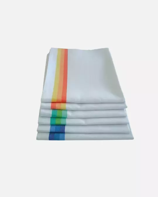 Professional-grade tea towels crafted from 100% yarn-dyed cotton, packaged in convenient sets of six. These kitchen essentials come in three classic striped designs, with two towels of each pattern per pack.