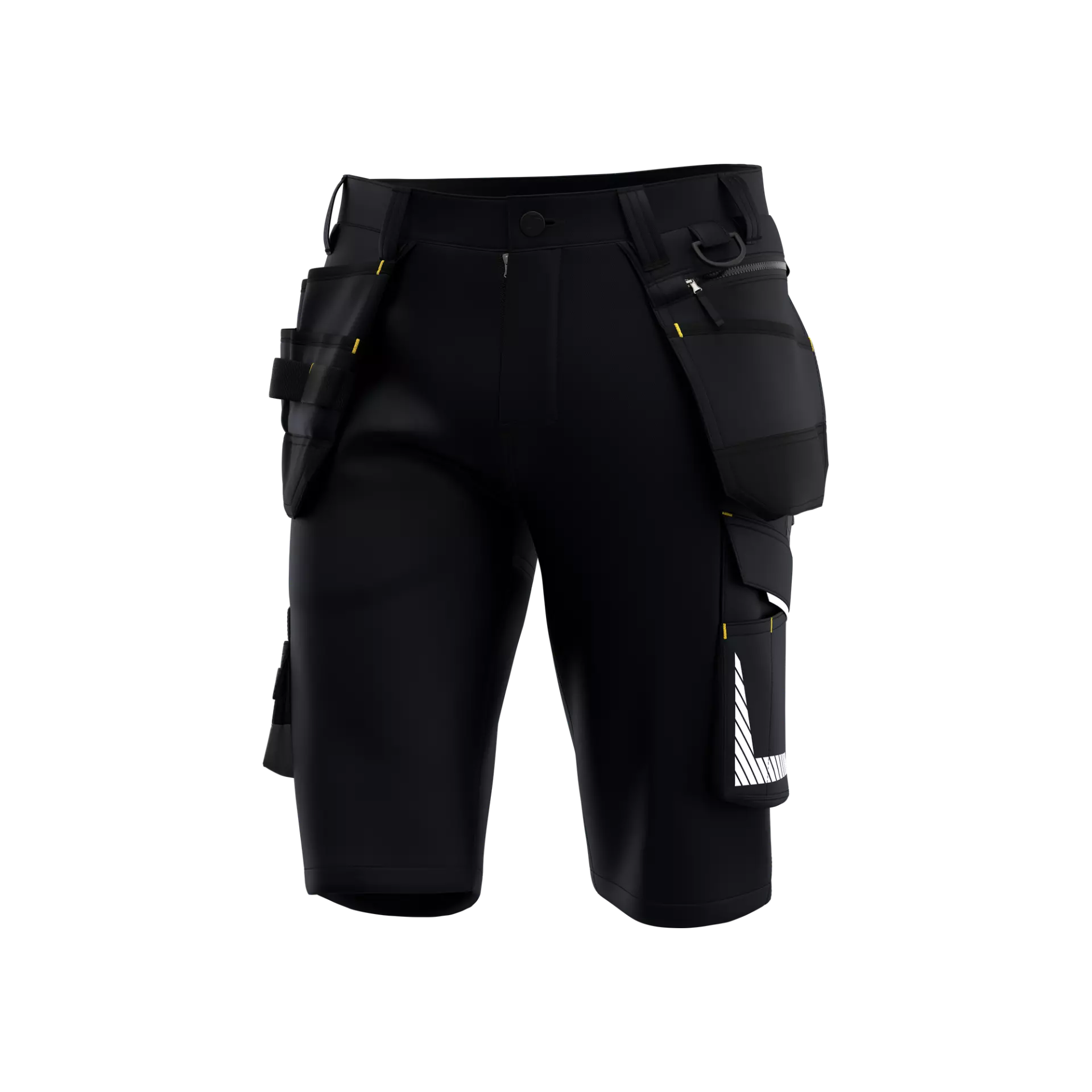 Functional and flexible work shorts designed for professional use across various industries. These shorts combine comfort with practicality through their 2-way stretch fabric and elastic waistband, ensuring optimal freedom of movement during work activities. The comprehensive pocket system includes reinforced holster pockets, multifunctional thigh pockets, and dedicated tool storage options, while reflective design elements enhance visibility in low-light conditions.