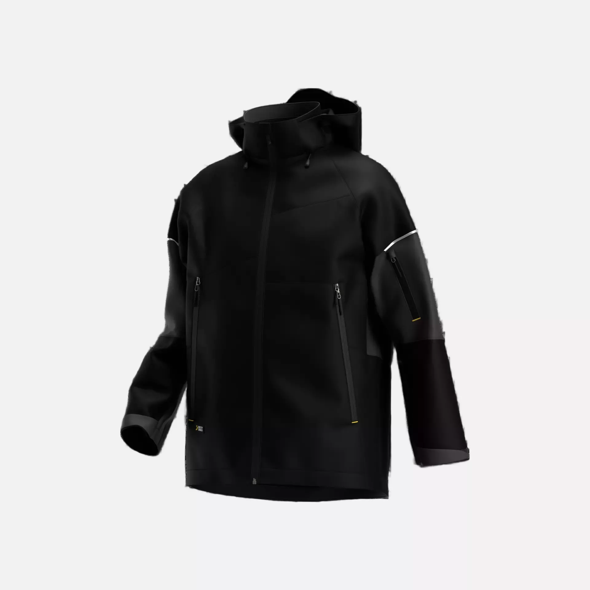 This high-performance rain jacket provides complete waterproof protection while maintaining freedom of movement in demanding work environments. Constructed from breathable 3-layer recycled polyester with taped seams, it offers exceptional weather resistance with 10,000 mm waterproofness and 20,000 g/m²/24h breathability. The thoughtful design includes reflective elements on sleeves and back for enhanced visibility and multiple specialized pockets for convenient storage.