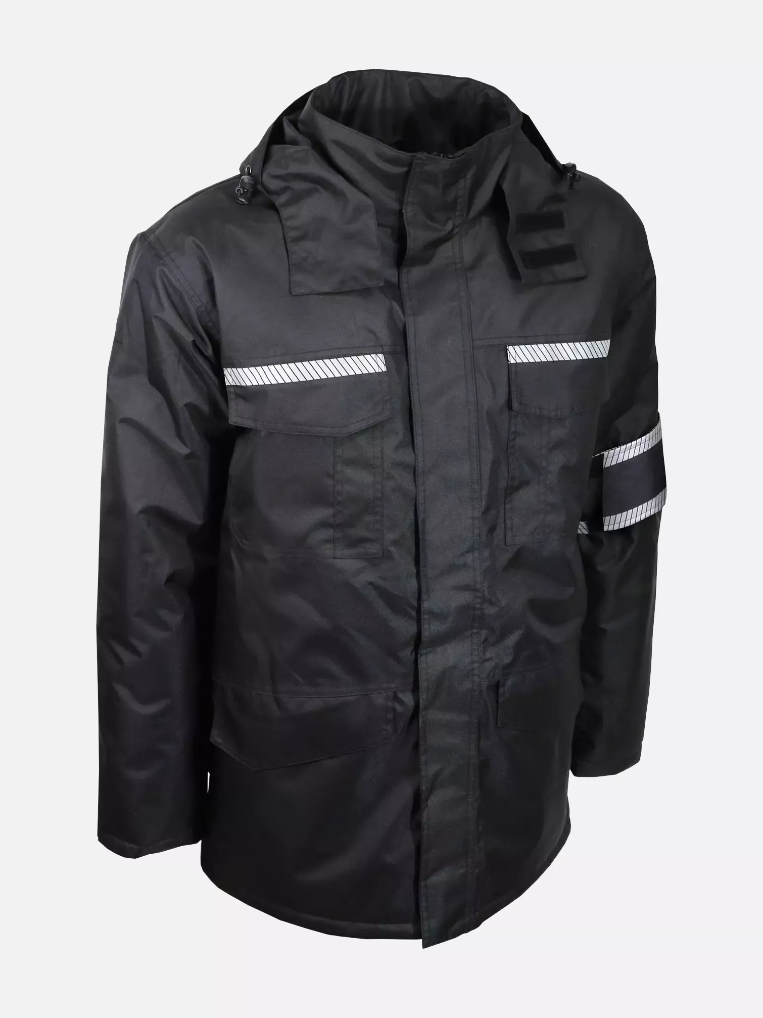 This protective parka combines durability and comfort with its waterproof Oxford polyester construction and warm polyester padding. Featuring segmented reflective strips for enhanced visibility and taped seams for weather protection, it's designed for professional use across multiple industries. The practical design includes a roll-away hood, multiple storage pockets, and a convenient zip access for customization.
