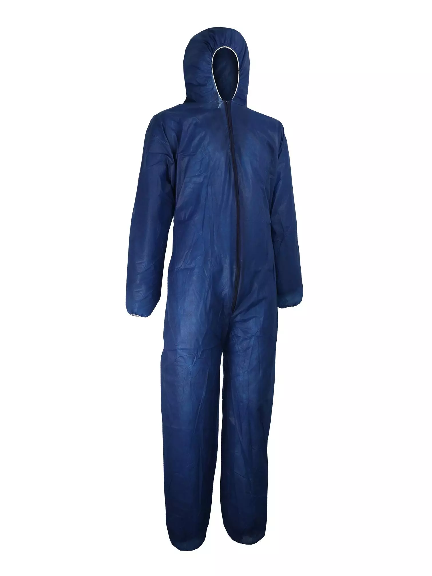 This single-use protective coverall is designed for protection against minor risks in various work environments. Made from lightweight non-woven polypropylene material, it offers comfort and freedom of movement while protecting clothing from dirt and preventing the spread of particles. The coverall features a fixed two-piece elasticated hood, front zipper closure, and elasticated waist, wrists, and ankles for a secure fit with other protective equipment.
