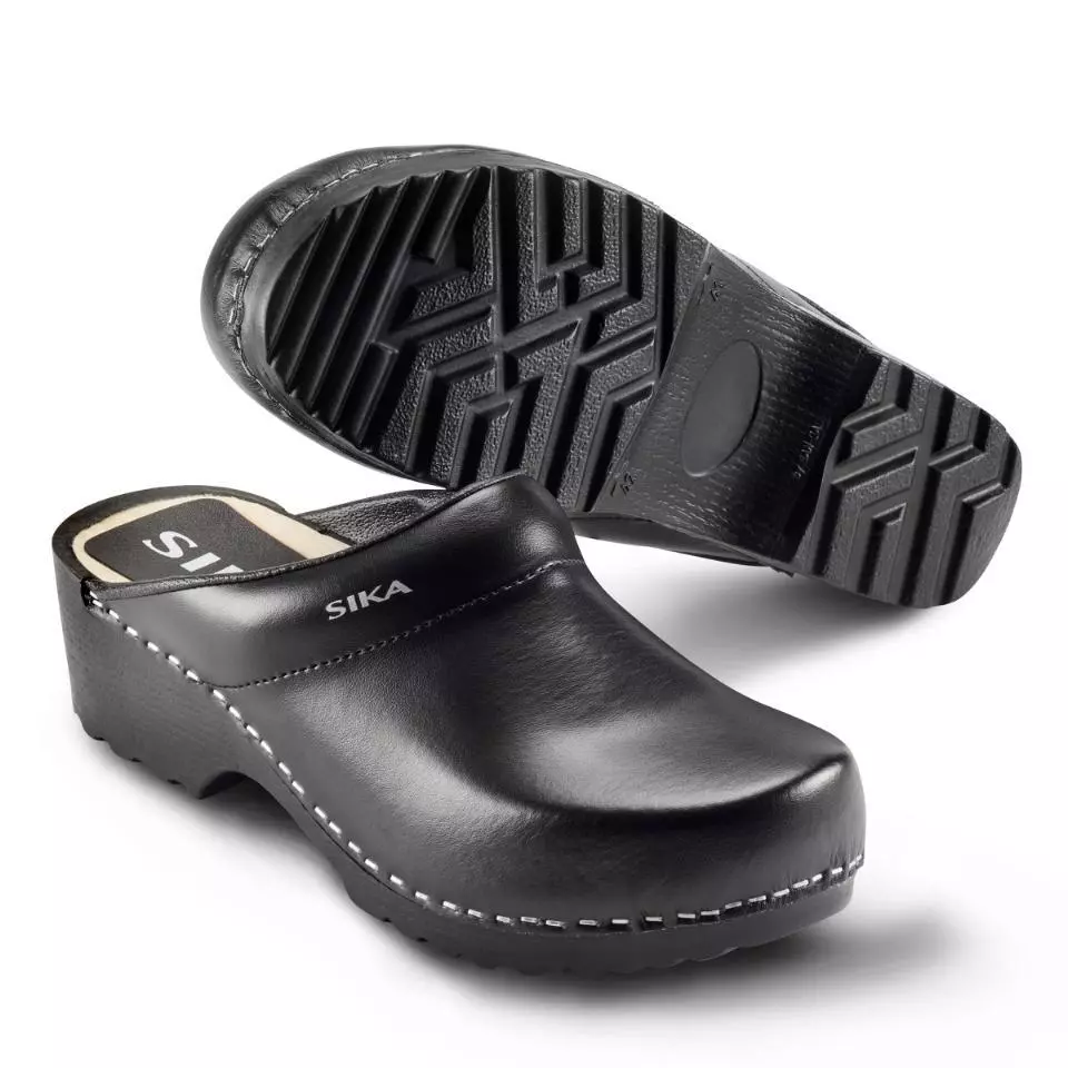 Robust clog without toe cap and with wide fit. Available in Black and White.