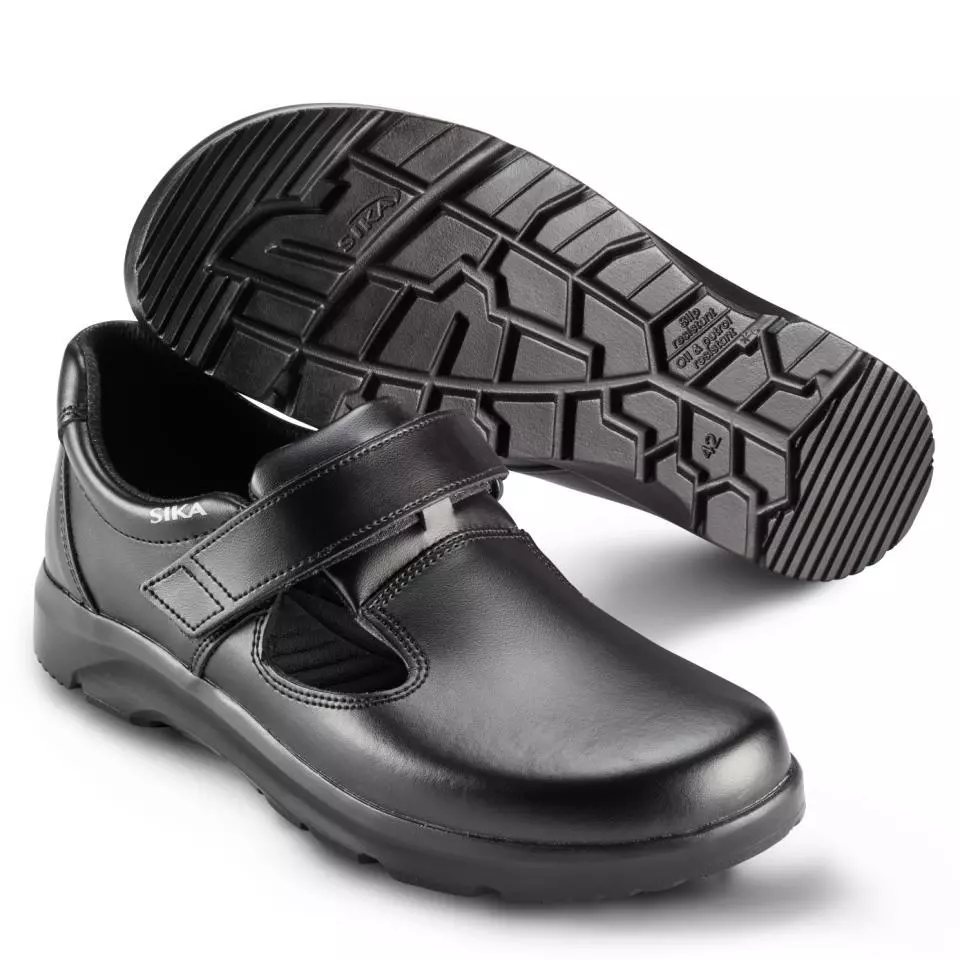 Lightweight and comfortable sandal with hook and loop fastener. Made of breathable and durable Permair® leather. Slip-resistant and shock-absorbing outsole. Wide heel area that reduces the risk of injuries from twisting the foot. Shock-absorbing and breathable insole made of lightweight and antibacterial material - washable at 30 °C. Lining made of sweat-transporting, breathable and durable textile. Available in Black and White.