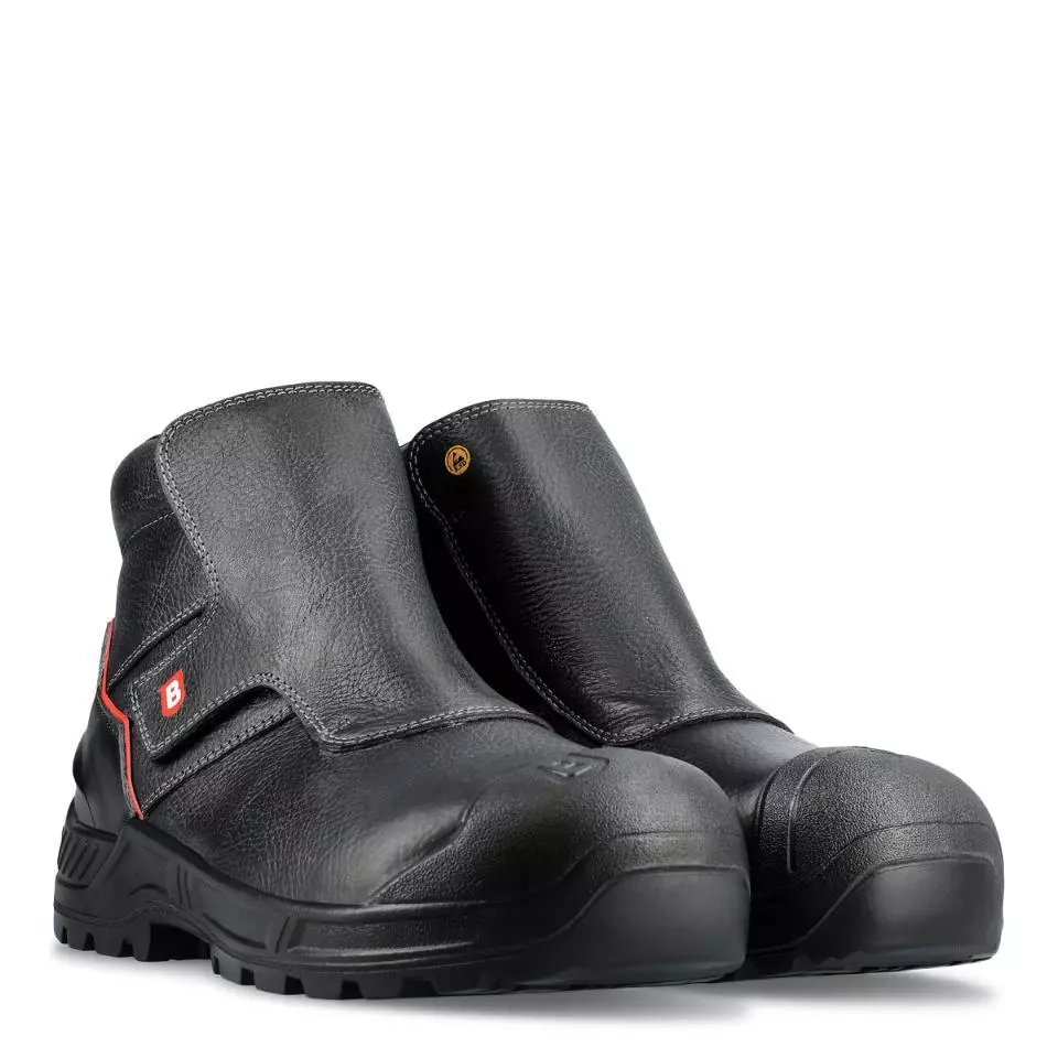 Wide, robust safety boots with simple Velcro fastening, approved as welding boots. The outsole is made of extra durable, flexible and shock-absorbing PU/nitrile rubber and can withstand hot surfaces up to 300°C. The sole features a stabilizing shank that prevents twisting and distributes pressure from the foot across the entire sole. Made of durable, breathable and water-repellent leather that adapts to the foot. The insole is made of shock-absorbing and sweat-wicking PU. The boot is ESD-approved, has a closed tongue and an extra durable ProNose.